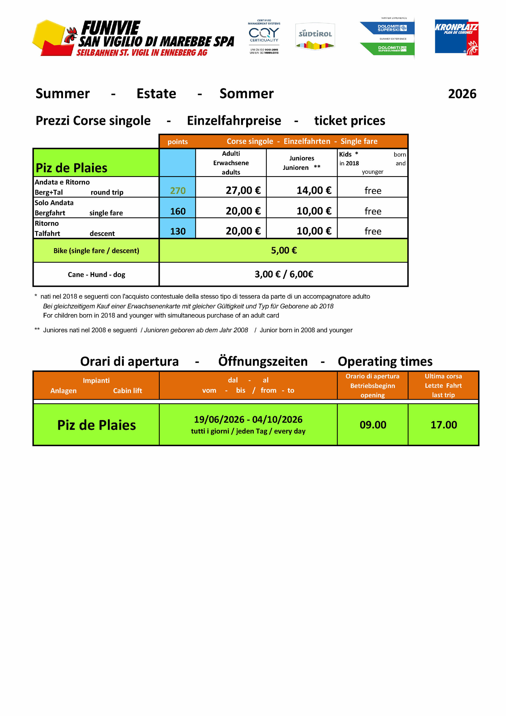 shows the ski pass prices for the summer season at Kronplatz.